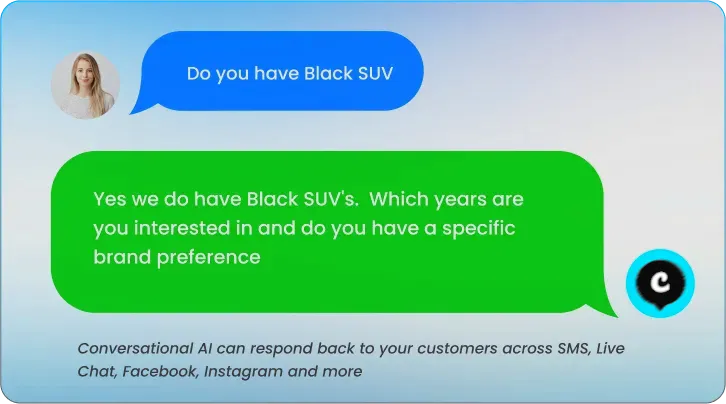 Ready to automate your customer engagement? Conversation AI can respond to customers across SMS, Live Chat, Facebook, Instagram, and more. The best part is that this AI doesn’t just respond with generic, canned answers. It learns from past conversations and training to answer your customers’ interactions more accurately. From booking appointments to qualifying leads, Conversation AI handles it all.