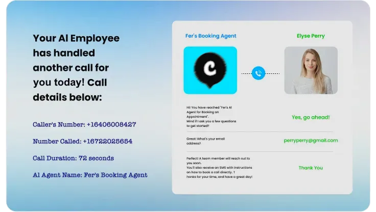 How many prospect calls do you miss in a week? 10? 25? 100? With Voice AI as your automated receptionist, you’ll never miss another call - even during off-hours. This helpful assistant answers missed calls, collects critical information, and transfers customers to human agents when necessary.