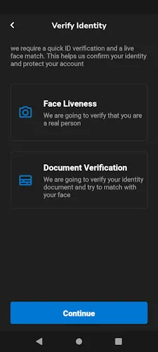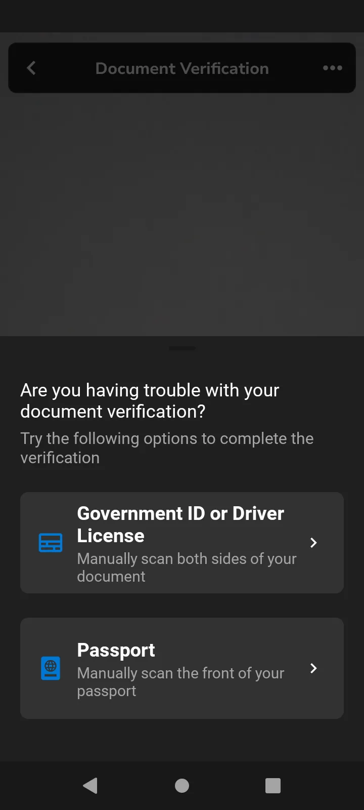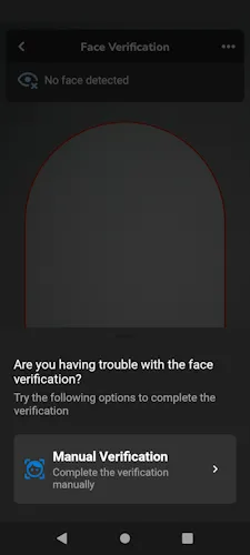 Manual Face Verification and Manual Document Verification can be if you have an issue with your device or the document you will be contacted by our customer service department to complete manual verifications. [>]