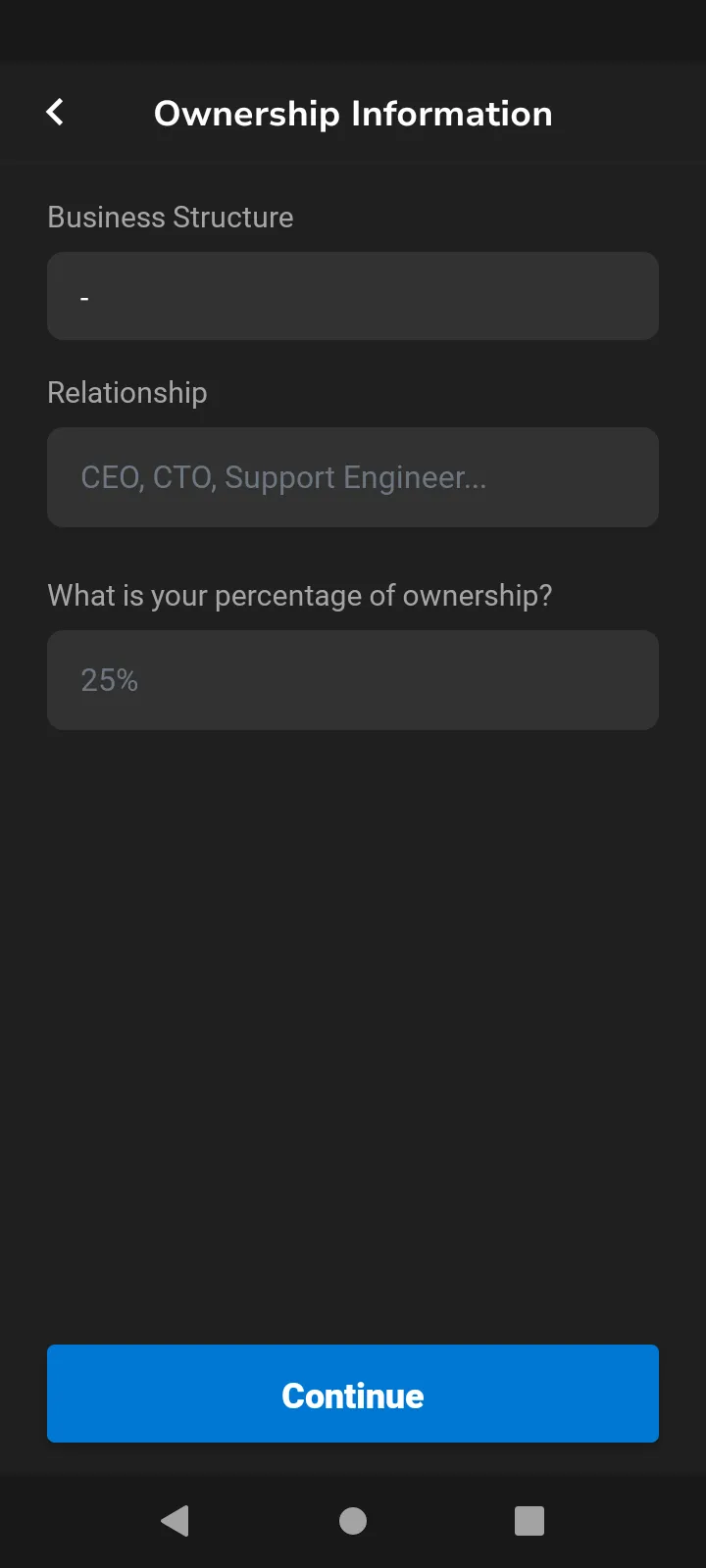 Select the business structure and your relationship or title with the business, and the percentage of the business you own or control.