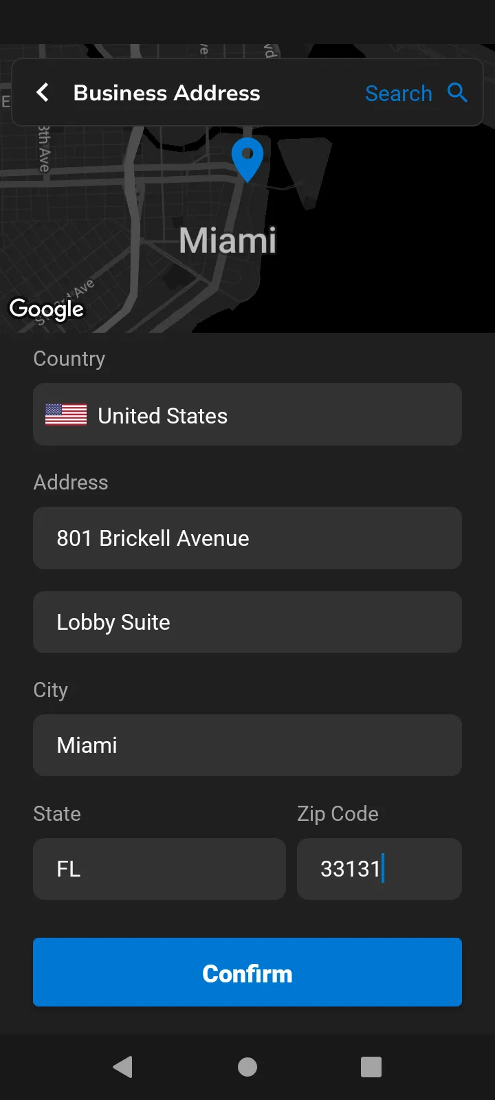 Enter your business address into the form, you can also select the Search Option in the top right corner to search for the address for easier input.