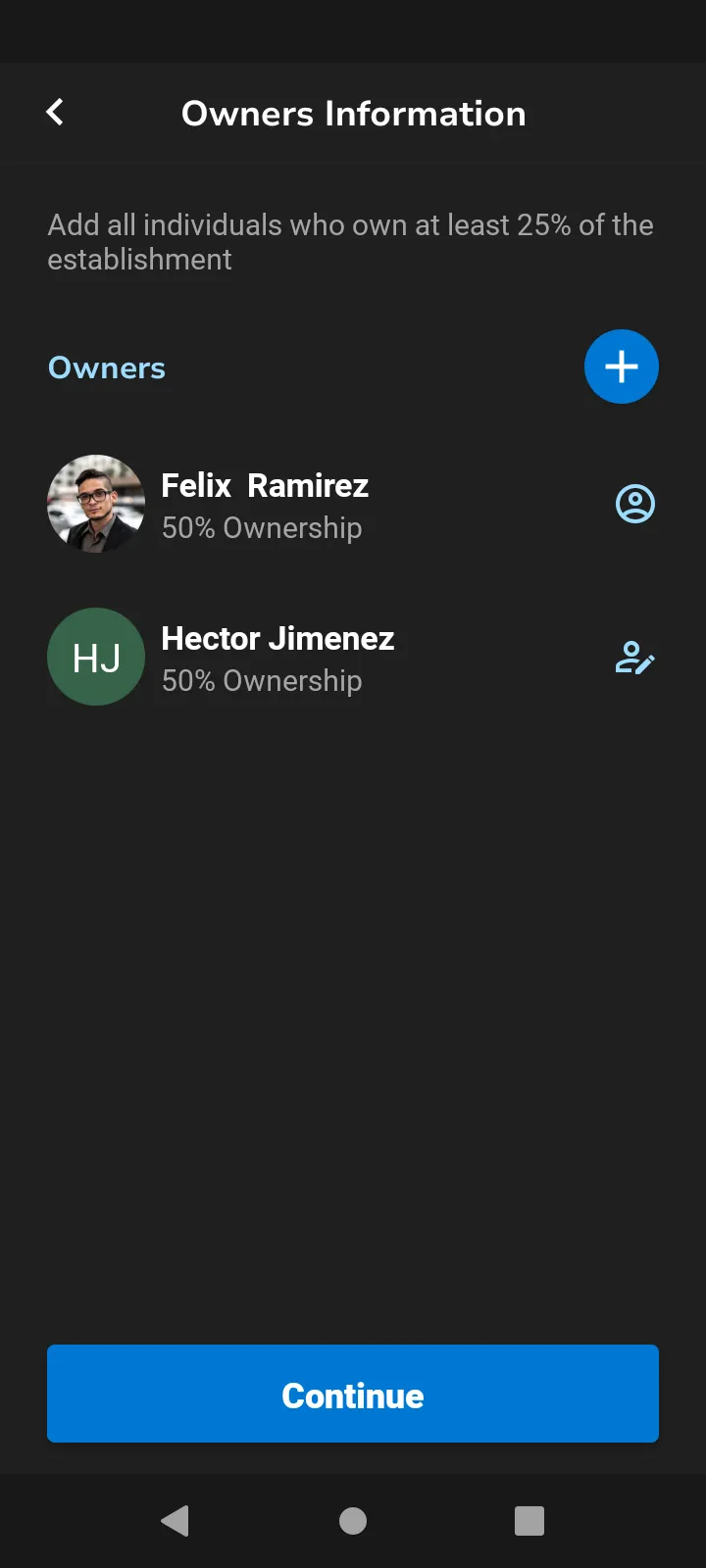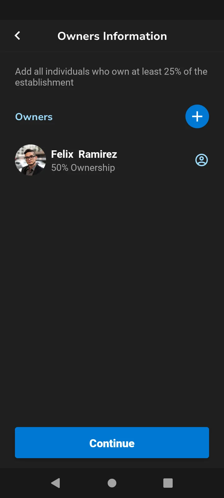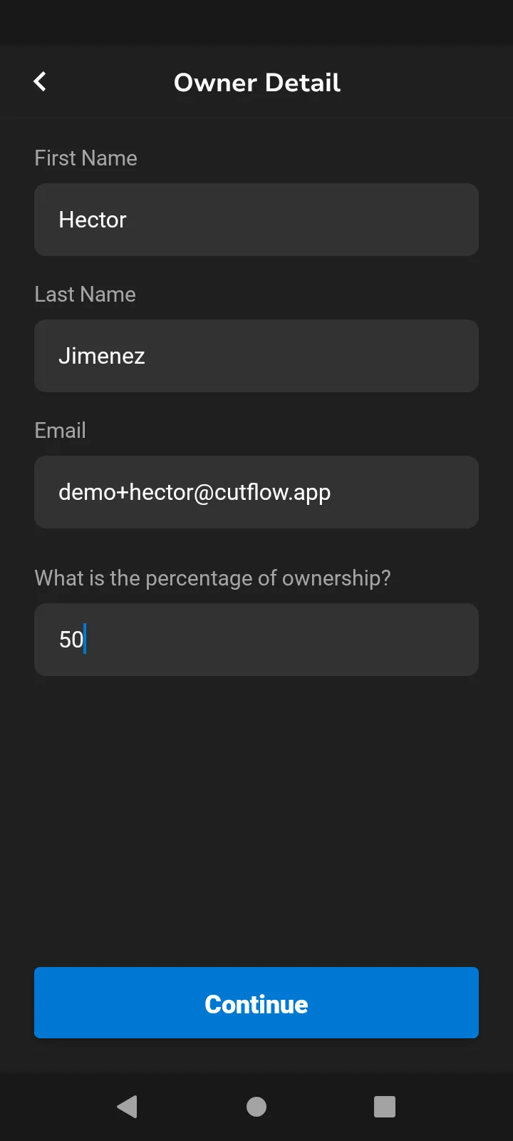 If your business has multiple owners Cutflow requires to verify the identity of registered business owners that have an ownership stack of 25% or more. Enter the name, email and percentage of ownership of the additional owners and they will be invited to join Cutflow and onboard to complete the business registration process.