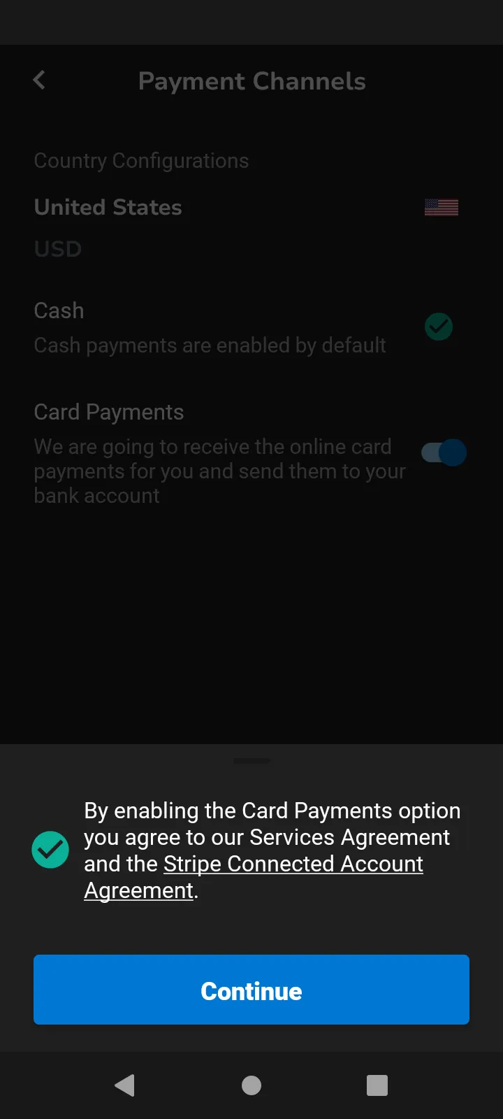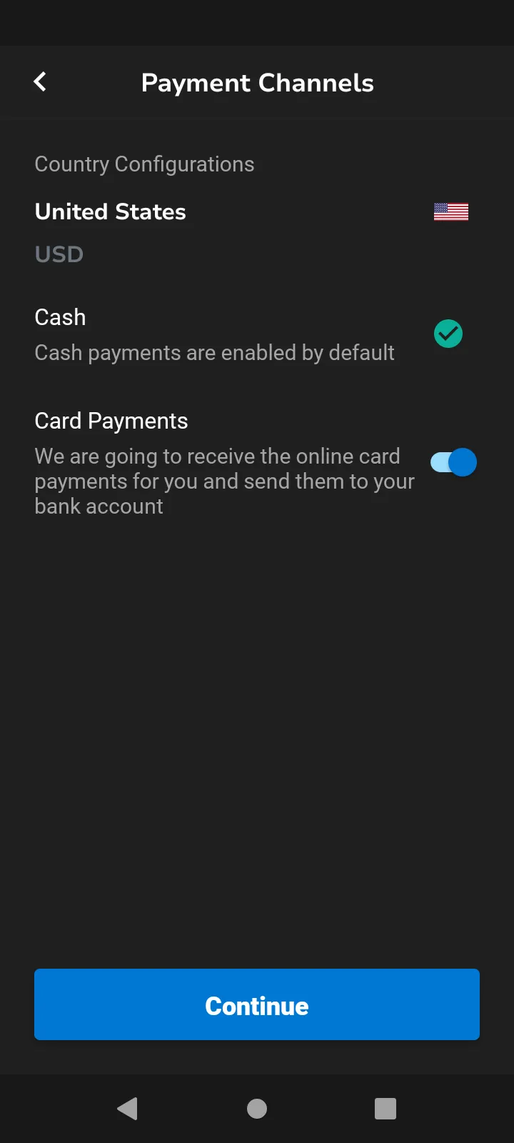 During onboarding, you will set up payment channels that include your primary currency and how you accept payments (e.g., cash, bank transfers, credit cards).