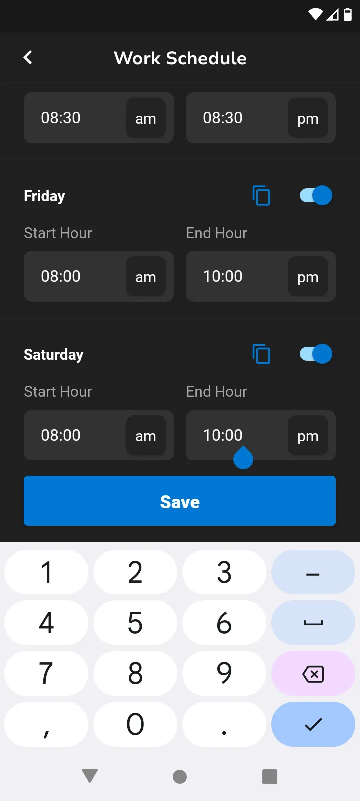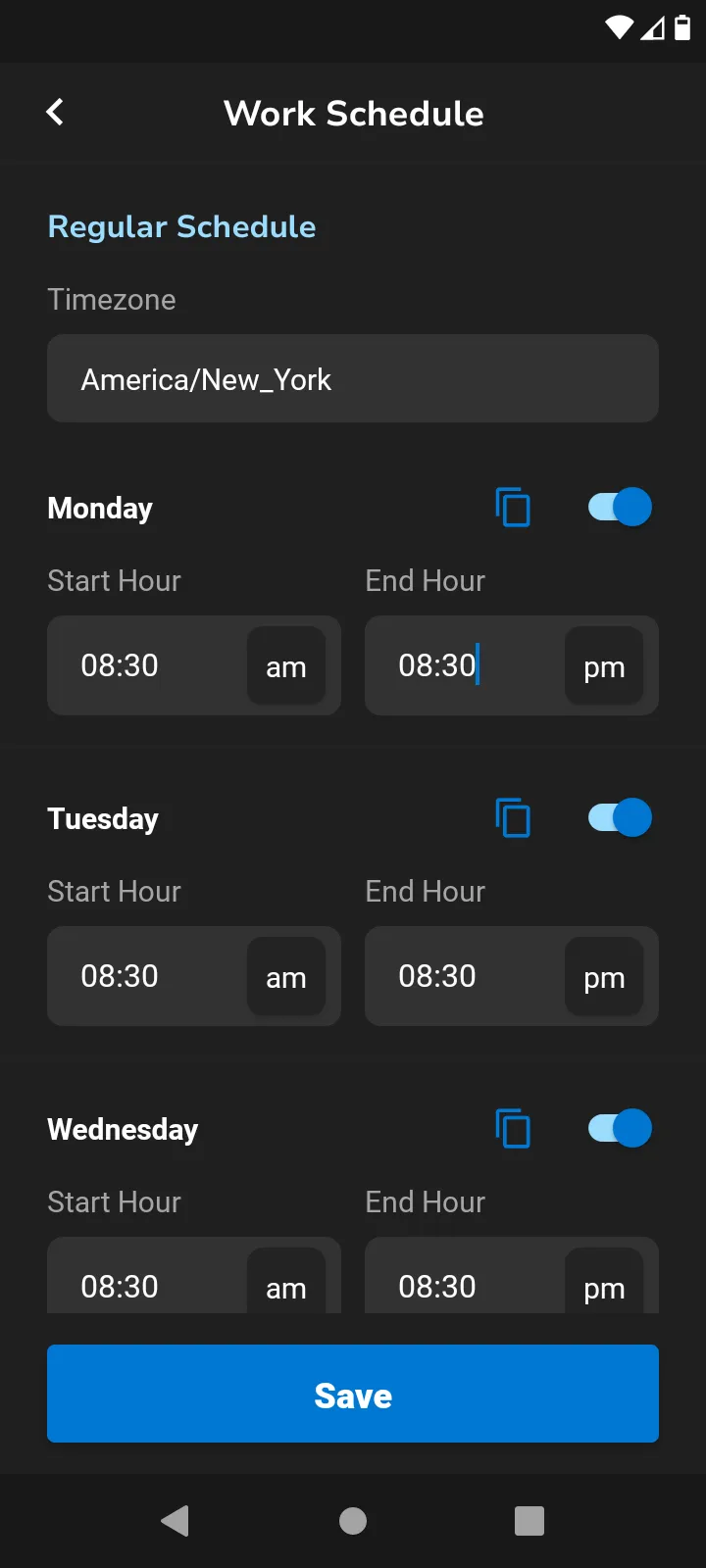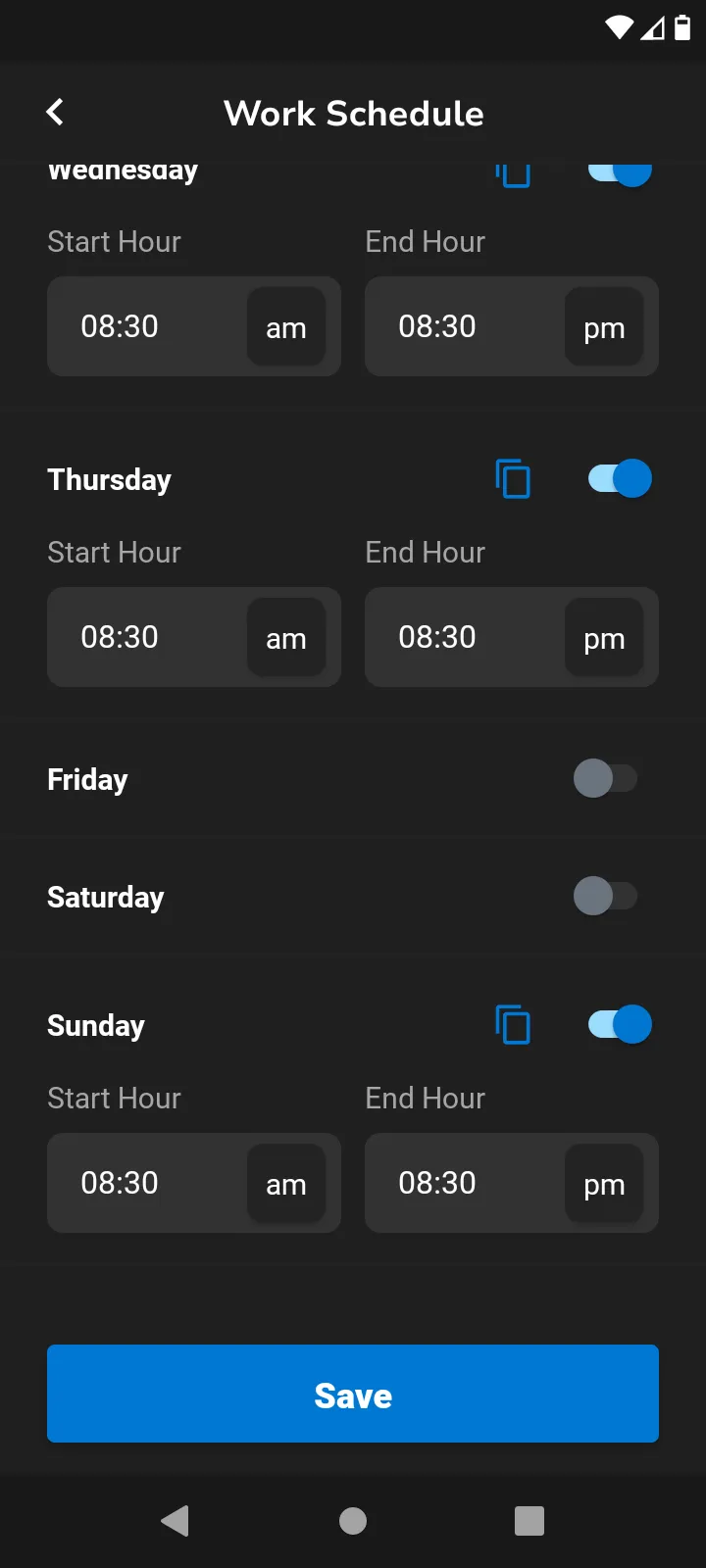 Toggle days on and off by selecting the button. You can select the blue copy icon and this will allow you to select multiple days to apply the same time to.
