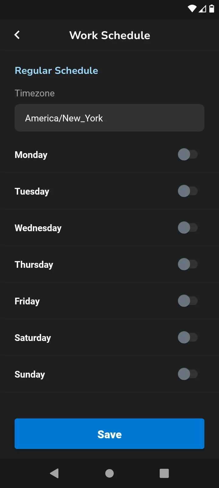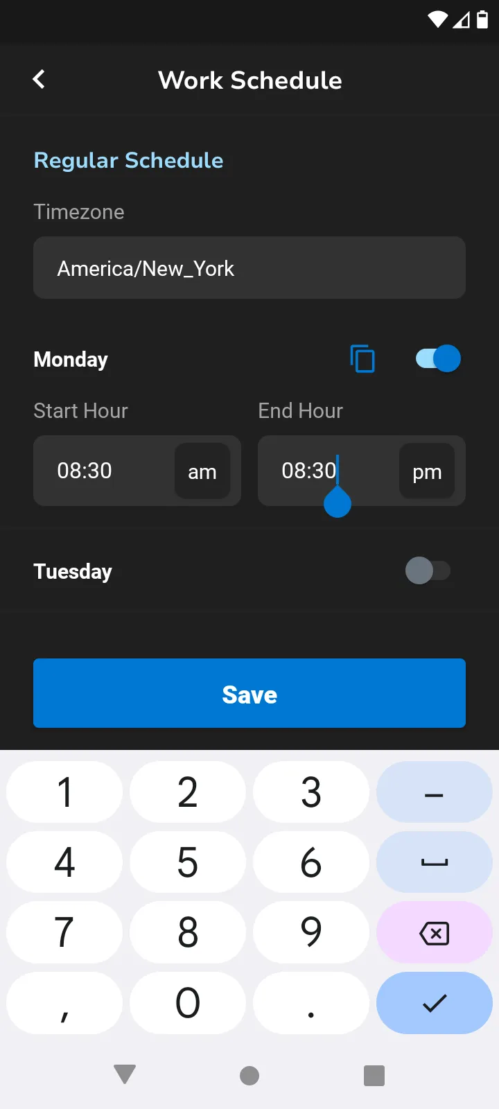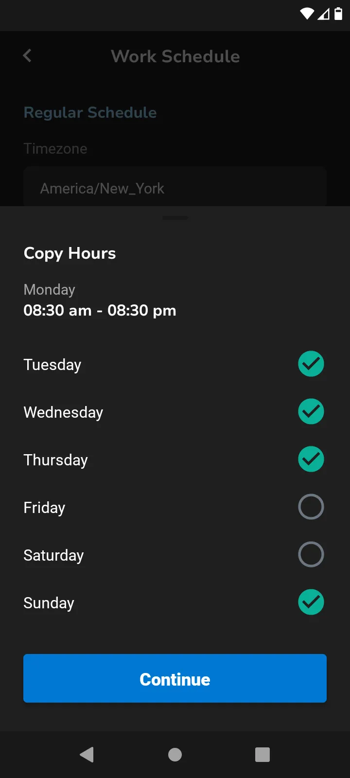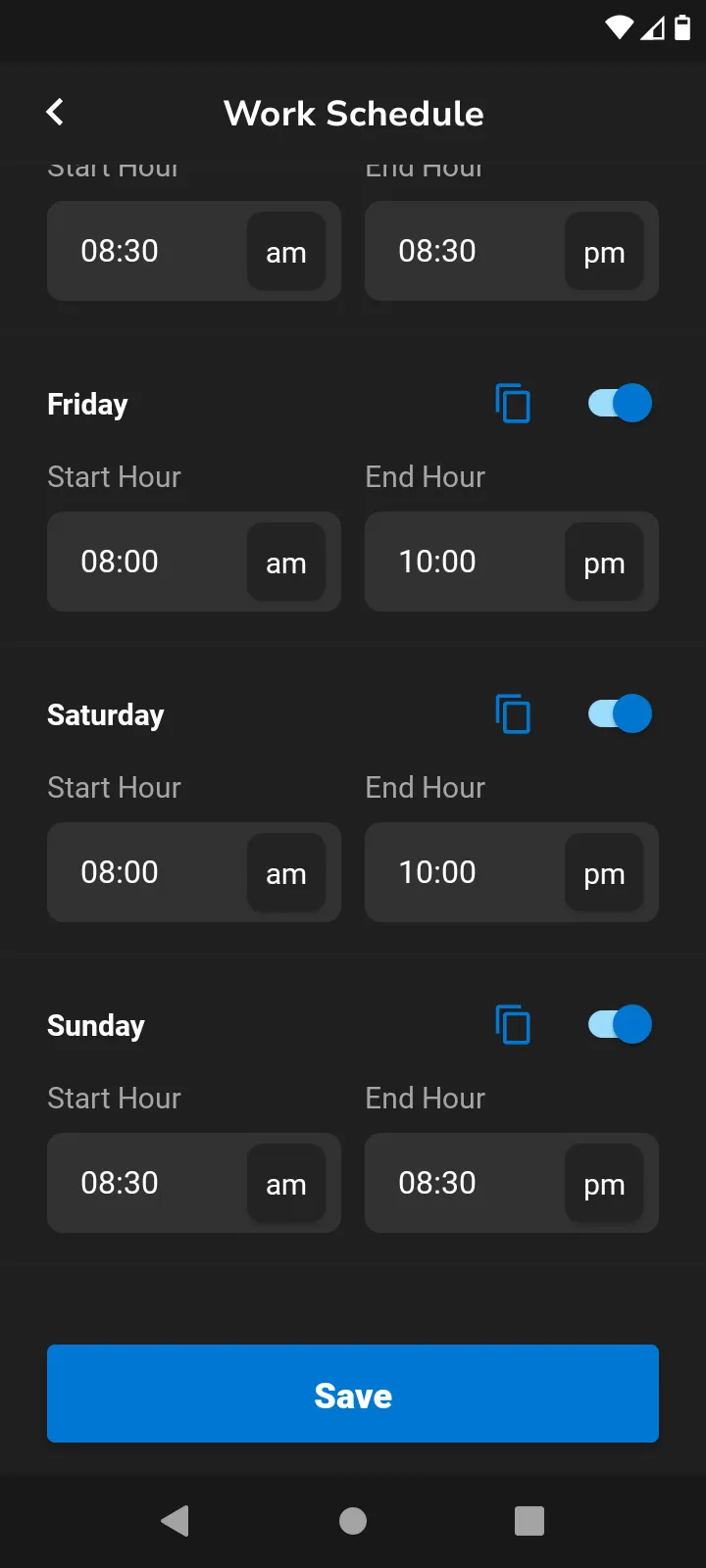 Toggle days on and off by selecting the button. You can select the blue copy icon and this will allow you to select multiple days to apply the same time to.