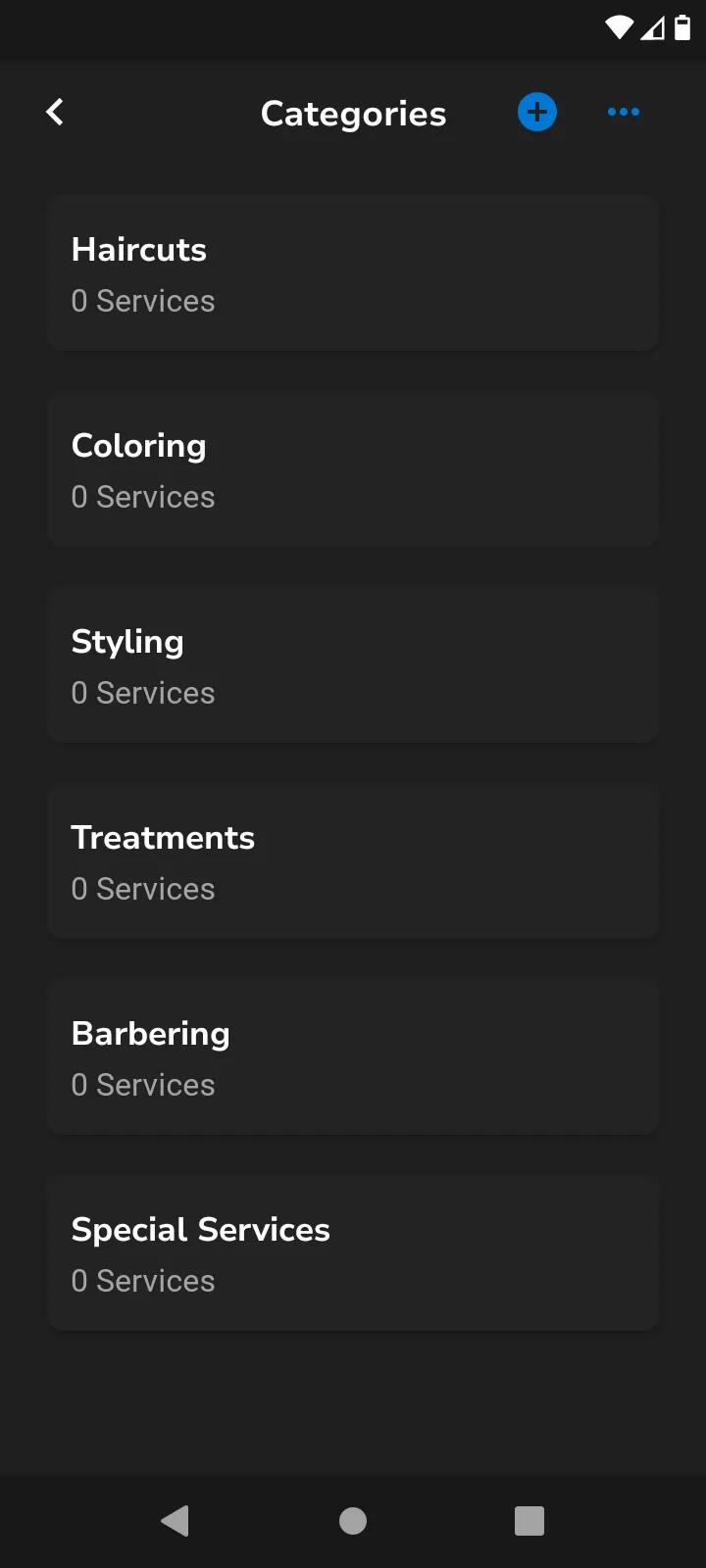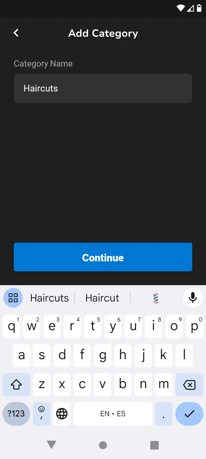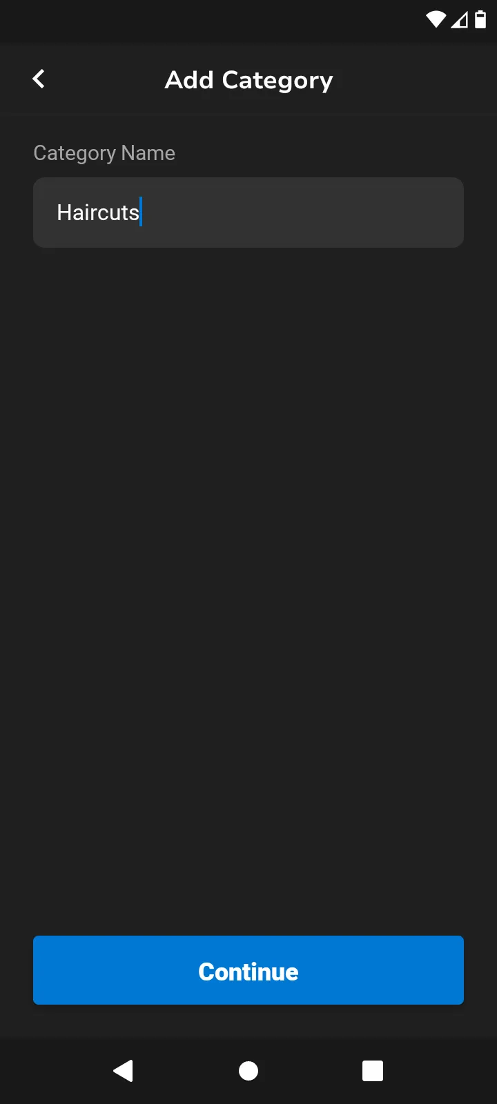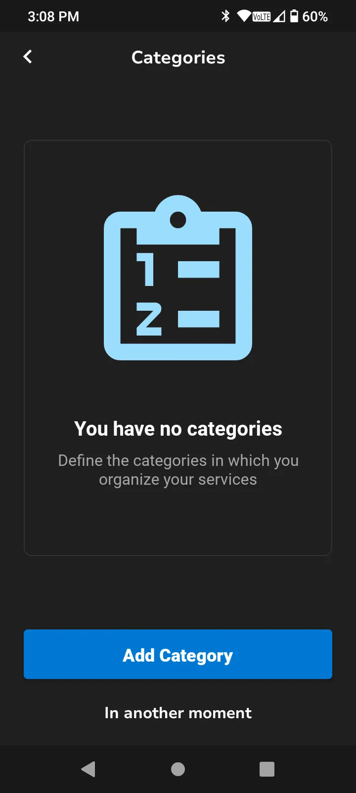 Enter the category name and click Continue to save. When you create a new category you will be prompted to enter services. You can select to do "In another moment" when you are doing initial setup to enter all of your categories at one time.