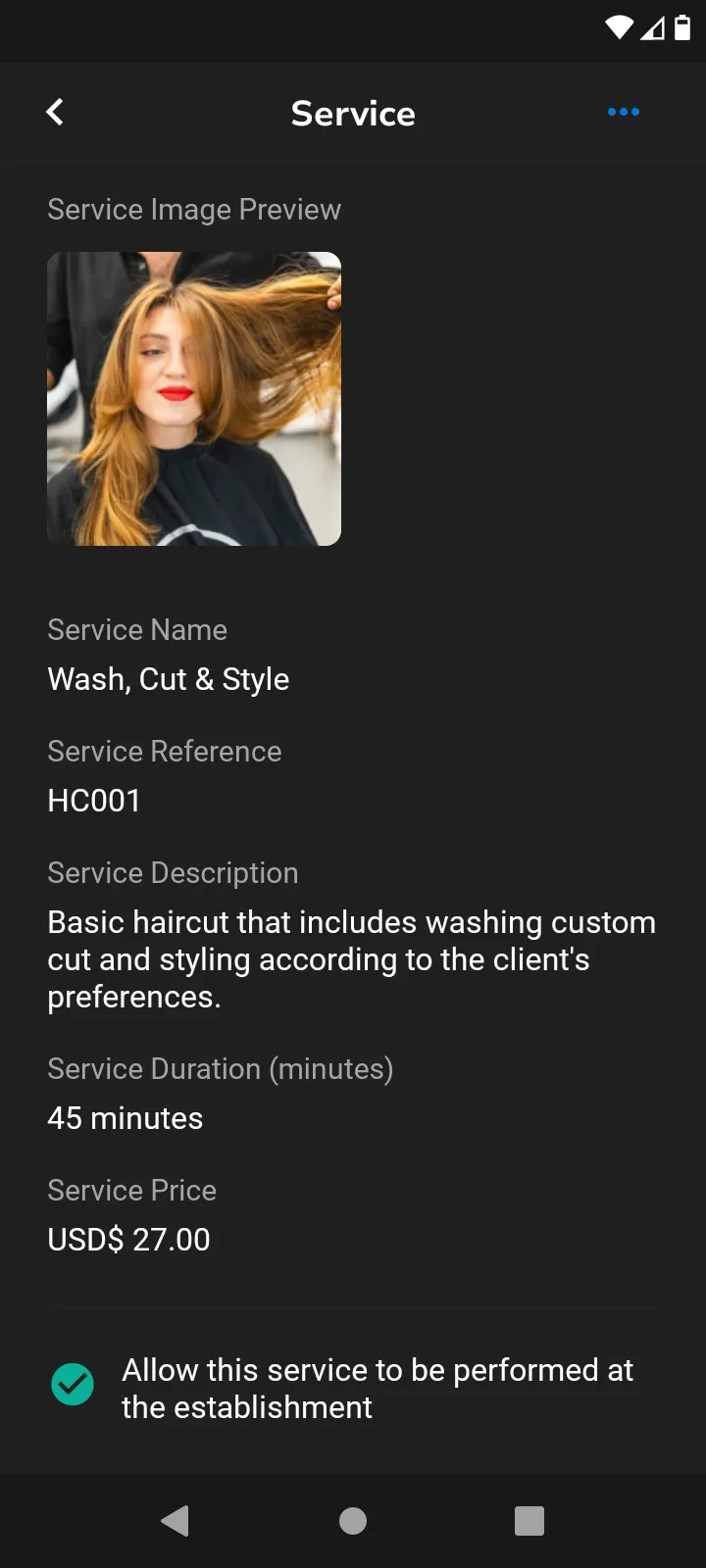 You can enable whether the service is provided in the establishment and / or on site at the customer's location.